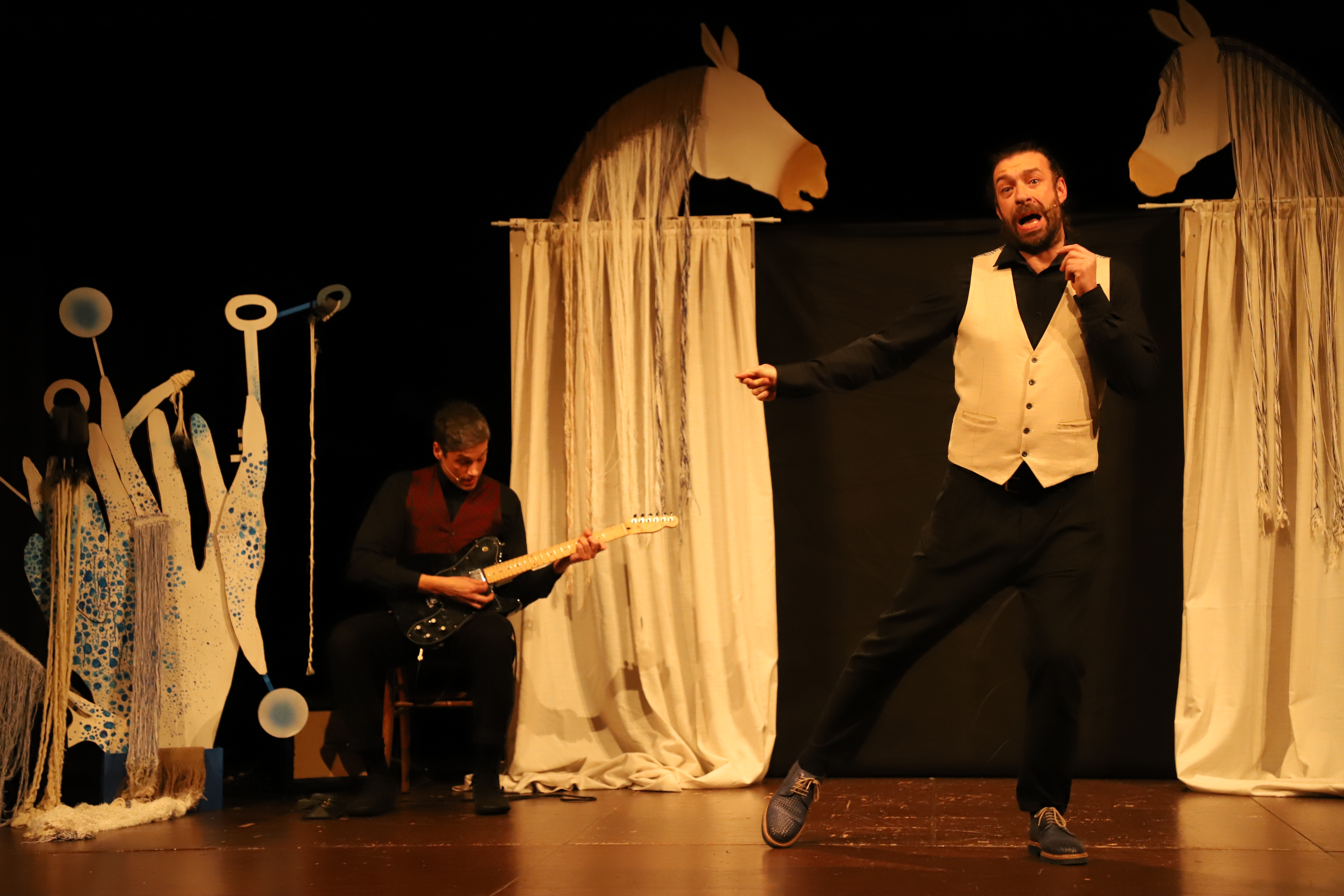 Musica e canzoni suonate dal vivo in scena: un musicista accompagna la favola con la